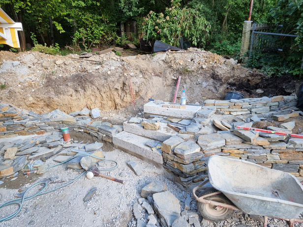 Silberquarzit Mauerwerk trifft auf Muschelkalk Fliesen und Granit.